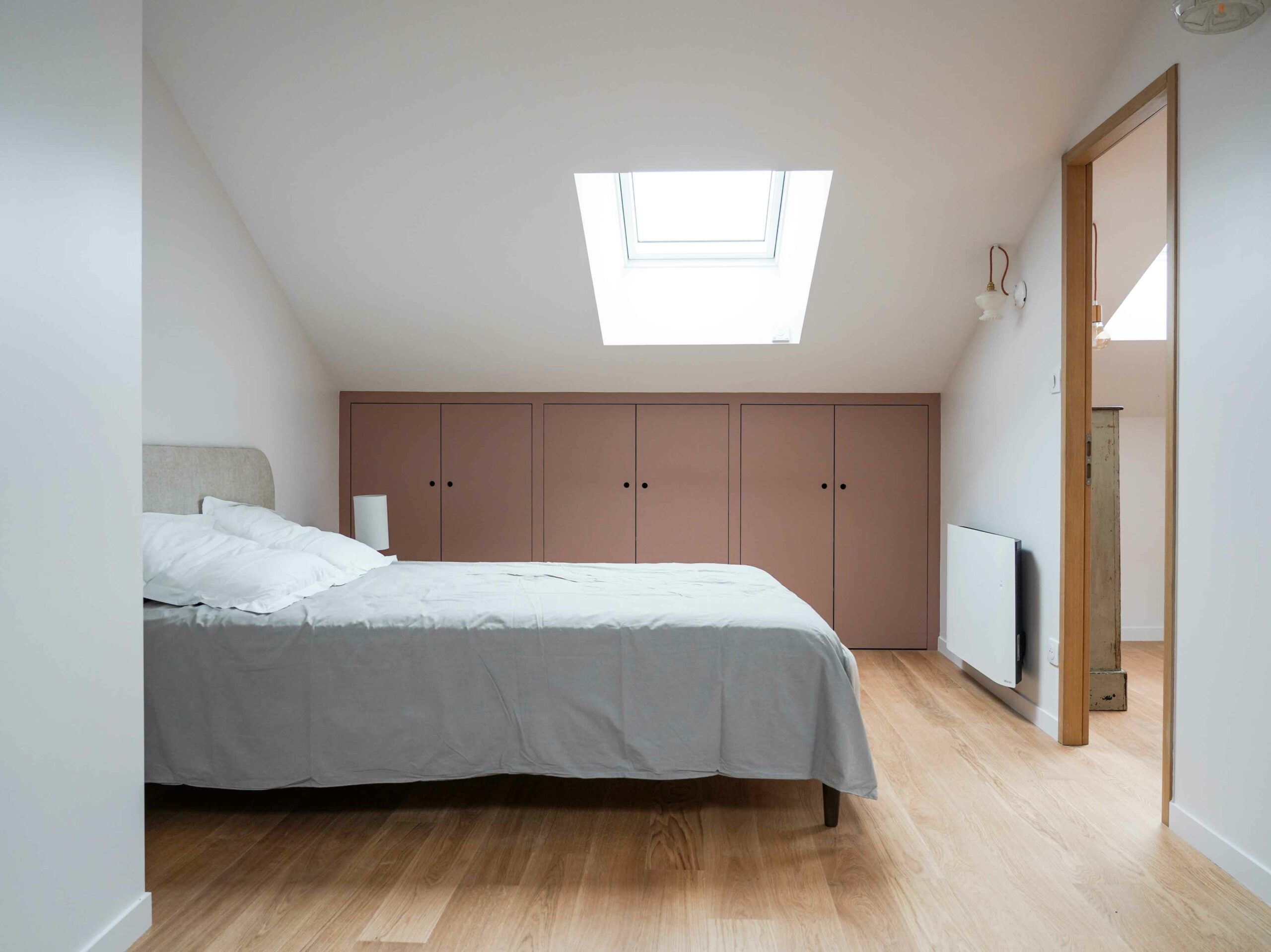 La maison existante ne comportait qu’une seule chambre, ce qui ne suffisait pas pour les nouveaux propriétaires. L’aménagement de la grange attenante permet ainsi à présent de créer les 3 chambres manquantes.
